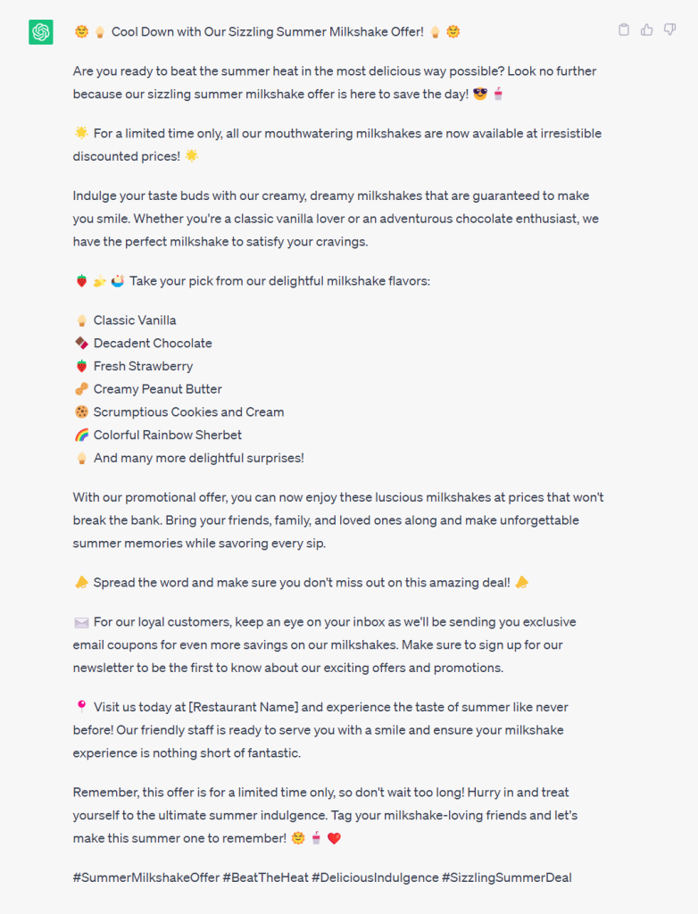 ChatGPT analyzes the customer’s order history and preferences to identify patterns and trends, enabling the customization of marketing messages and promotions. For instance, if a customer ordered milkshakes more frequently, you can send a promotion regarding a new milkshake. Messages that are personalized to customers’ specific preferences and interests are more likely to resonate positively with them. Feeling valued and appreciated, they are more inclined to revisit the restaurant and continue their patronage.