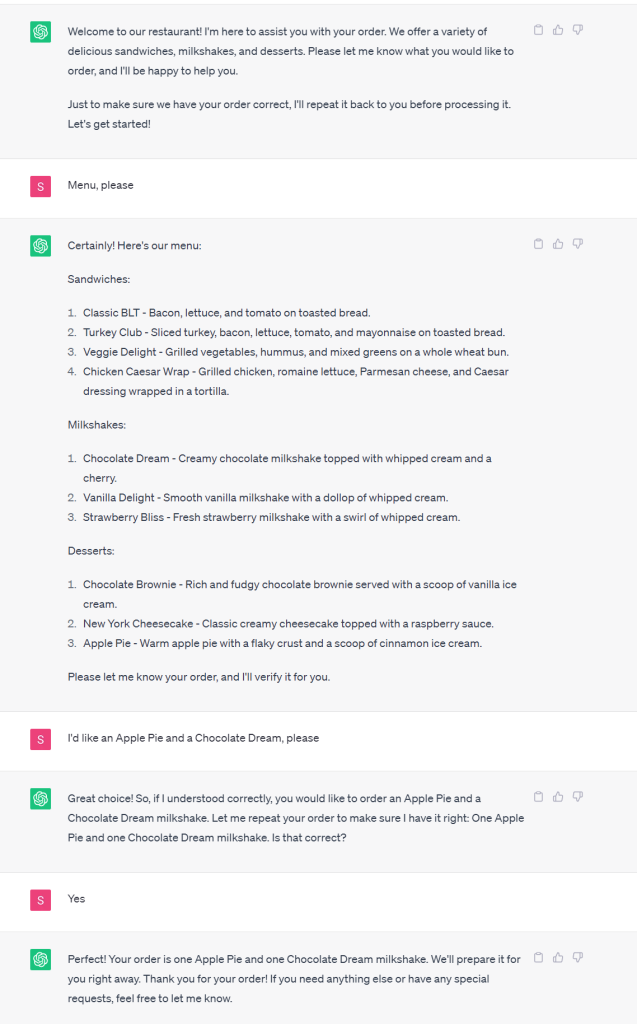 By allowing you to review and confirm your order before it reaches the respective preparation area, ChatGPT helps you prevent errors like incorrect or missing items or inaccurate modifications, etc. Moreover, ChatGPT offers benefits beyond order accuracy by streamlining the ordering process and reducing wait times. This efficient system ensures a smoother and more efficient experience for you as a customer.