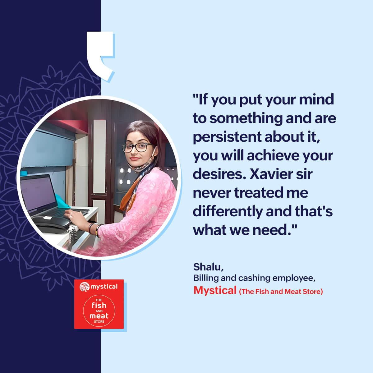 Ashish's journey is just one example of Mystical Fish and Meat Store's commitment to inclusivity. Shalu, another valued member of the team, is an example of resilience and determination. Despite facing physical challenges from having only one hand, Shalu handles billing and cash transactions with remarkable efficiency.
