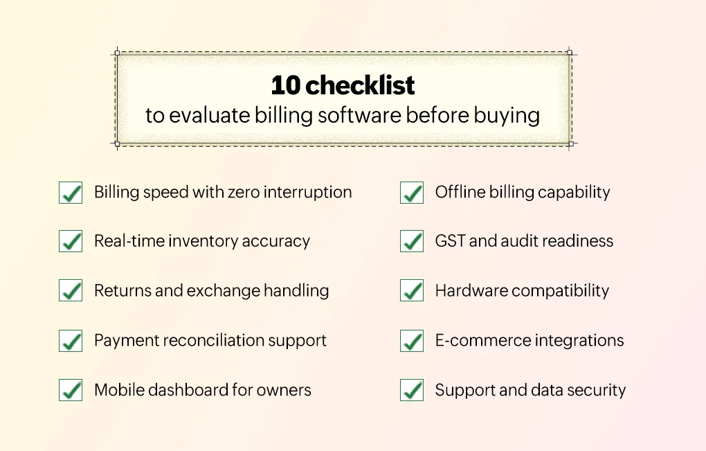The right billing software should handle real store pressure, stay compliant, remain easy for staff, and scale securely as the business grows. Use this checklist to evaluate software in real conditions instead of relying on features listed in brochures.