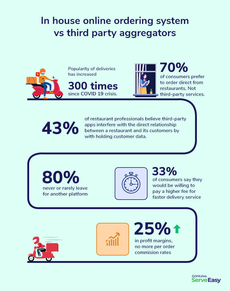 There are two ways by which restaurants can go online, one way is by listing themselves on third party aggregator platforms and the other way around is by getting their own in house online ordering system.