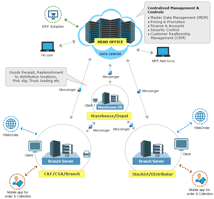 HQ - Centralized Business Management Solution | DE - Distribution Management Solution | NT - Electronic Data Interchange (EDI) tool | EarnSmart - Mobile App for field sales Order Training & Collection | WebOrder - Web based Order Management Tool for sales ordering | DB - Database | (n) - Single or Multiple