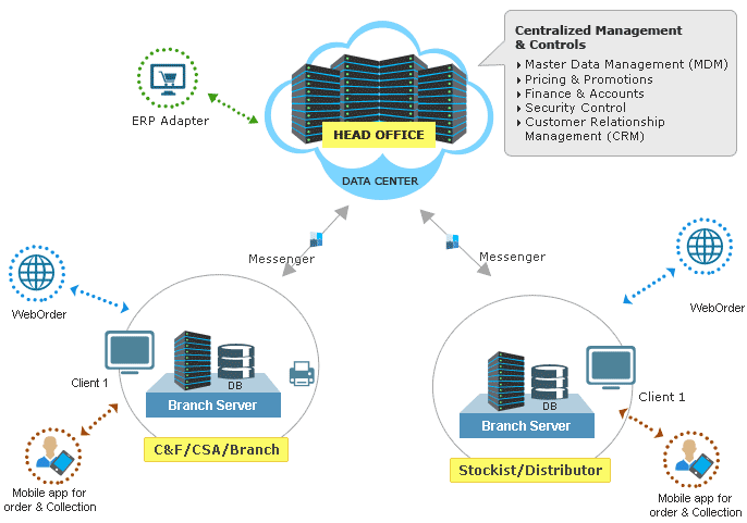 HQ - Centralized Business Management Solution | DE - Distribution Management Solution | NT - Electronic Data Interchange (EDI) tool | EarnSmart - Mobile App for field sales Order Training & Collection | WebOrder - Web based Order Management Tool for sales ordering | DB - Database | (n) - Single or Multiple