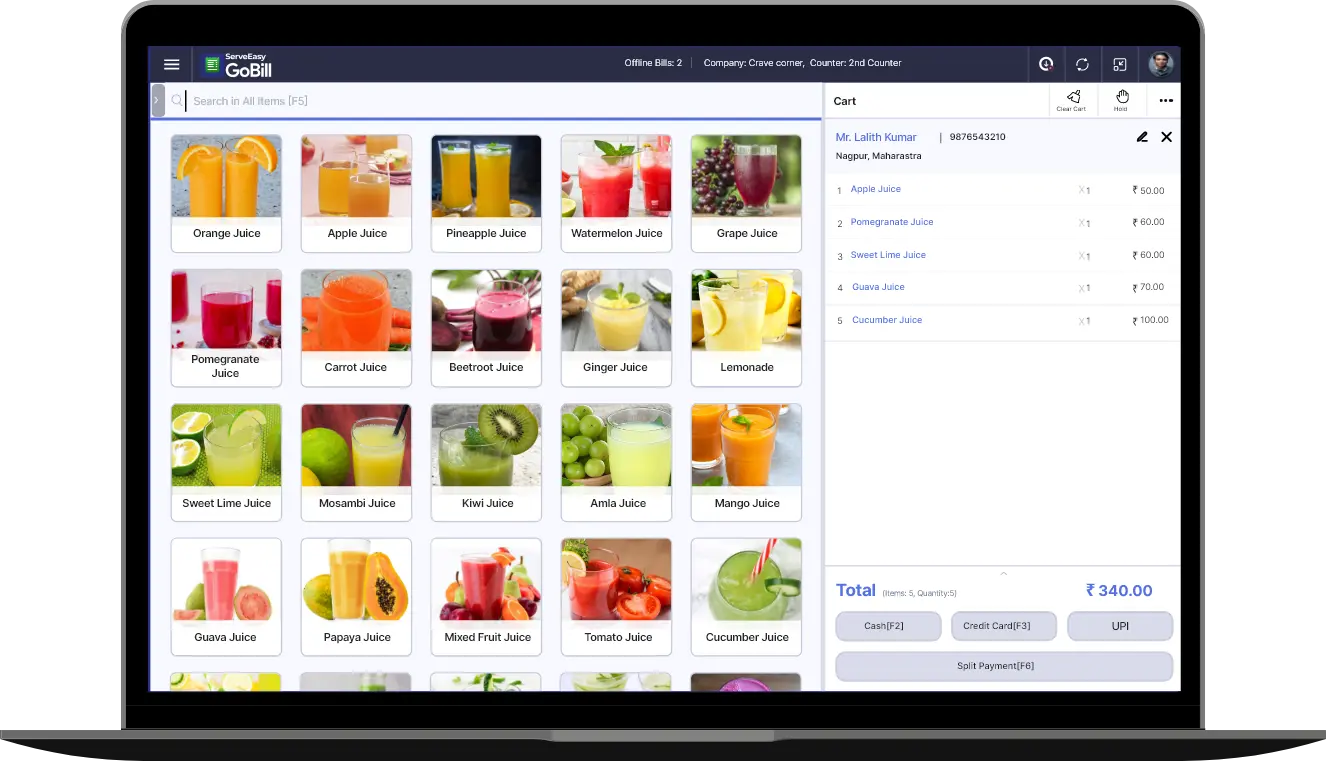 Juice shop POS is a software to automate the billing, orders and helps restaurateurs accelerate sales, profits, and customers by eradicating the manual efforts involved. With the help of its key features like effective inventory and wastage monitoring, customized offers and combos, integrated mobile app notifications, easy integration with N number of online aggregators, and loyalty management it is easier to keep track of your business with just a tap on your phone.